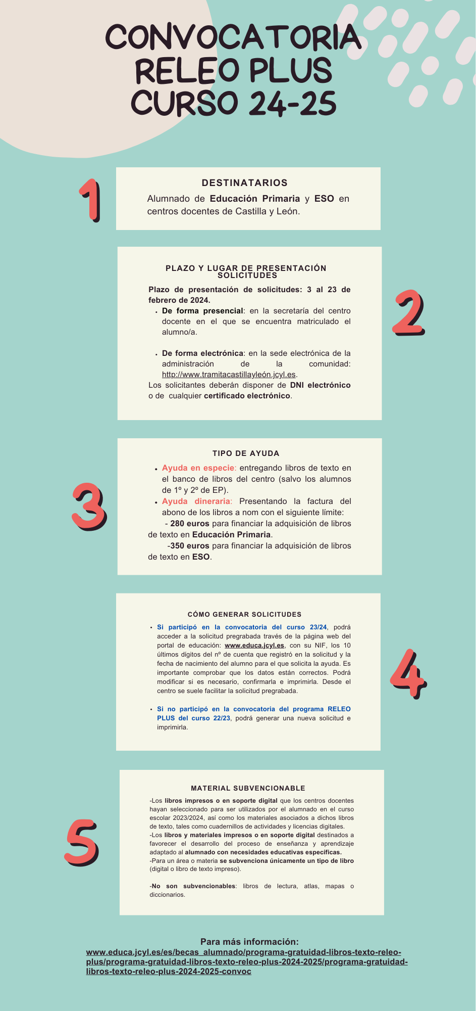 En la siguiente infografía elaborada por el EOEP tienes toda la información relativa a la convocatoria para el próximo curso 2024/2025 sobre el RELEO PLUS.
